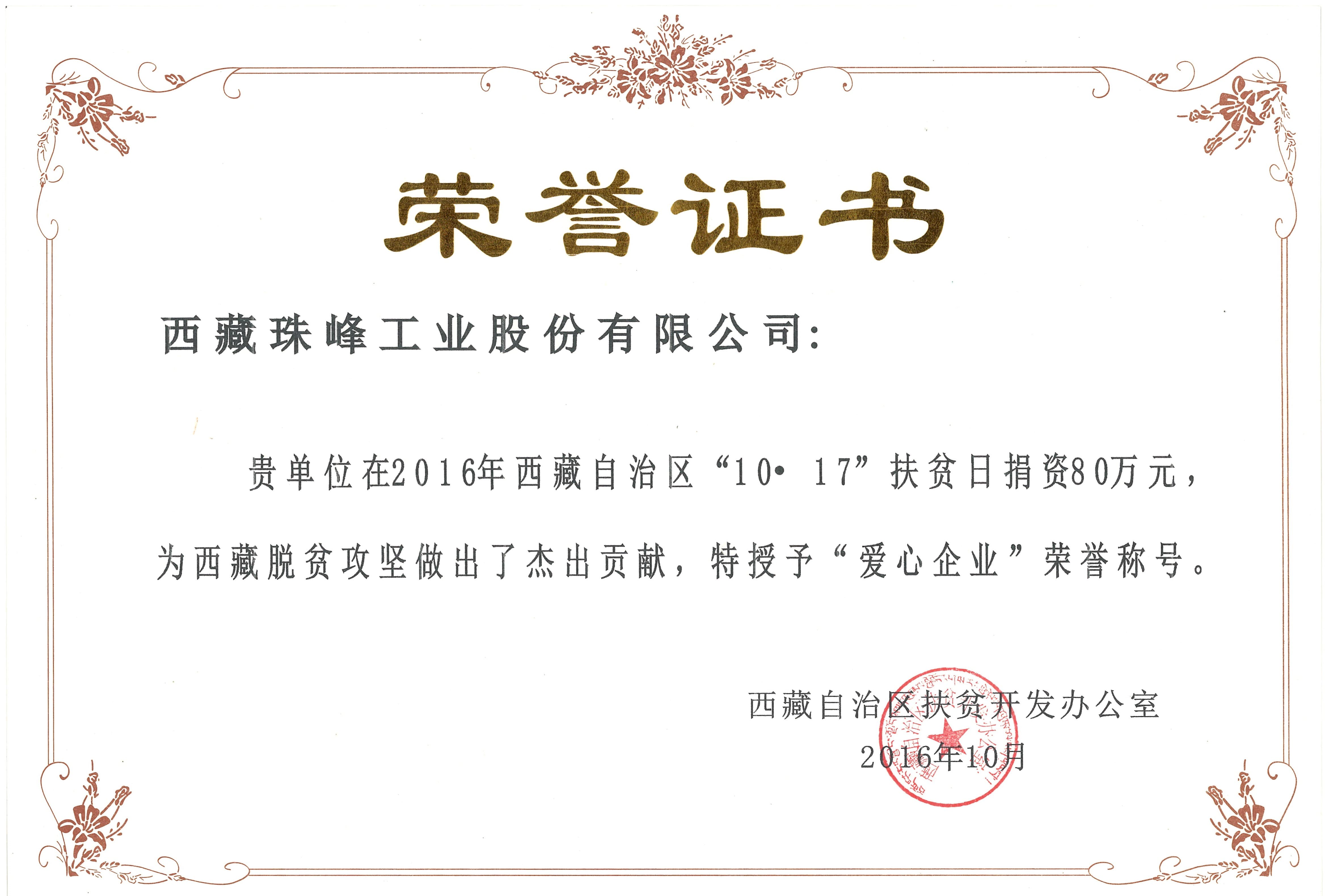 西藏自治區(qū)授予“愛心企業(yè)”稱號(hào)