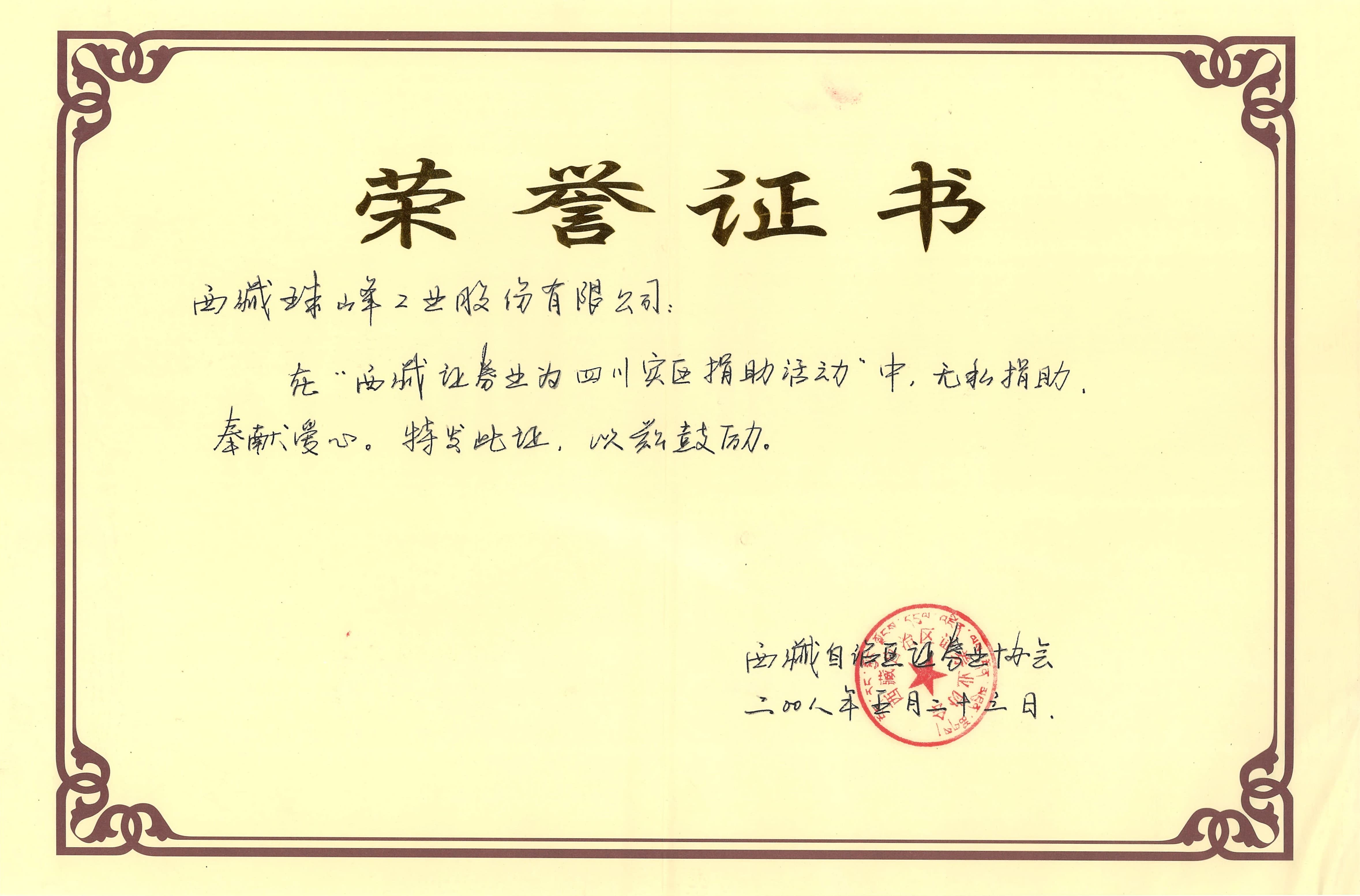 四川災(zāi)區(qū)捐助活動(dòng)榮譽(yù)證書